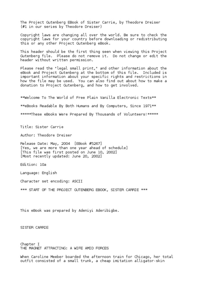 Sister Carrie By Dreiser Theodore 1871 1945 Pdf Sister Carrie Project Gutenberg